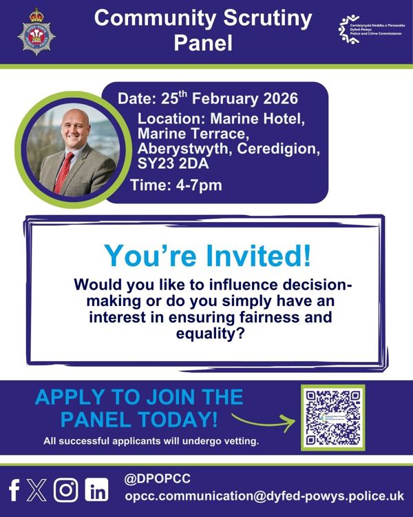 The panel acts as an independent public voice, providing views and recommendations to Dyfed-Powys Police to help strengthen transparency, accountability and the public confidence in policing.