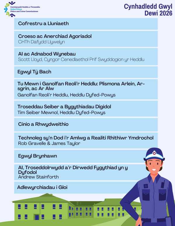 Bydd Comisiynydd Heddlu a Throseddu Dyfed-Powys yn cynnal ei 10fed Gynhadledd Dydd Gŵyl Dewi ar 4 Mawrth 2026, gan ddod â gweithwyr proffesiynol plismona, academyddion, partneriaid a rhanddeiliaid ynghyd i archwilio sut mae arloesedd digidol a thechnoleg sy'n dod i'r amlwg yn llunio plismona modern a diogelwch cymunedol.